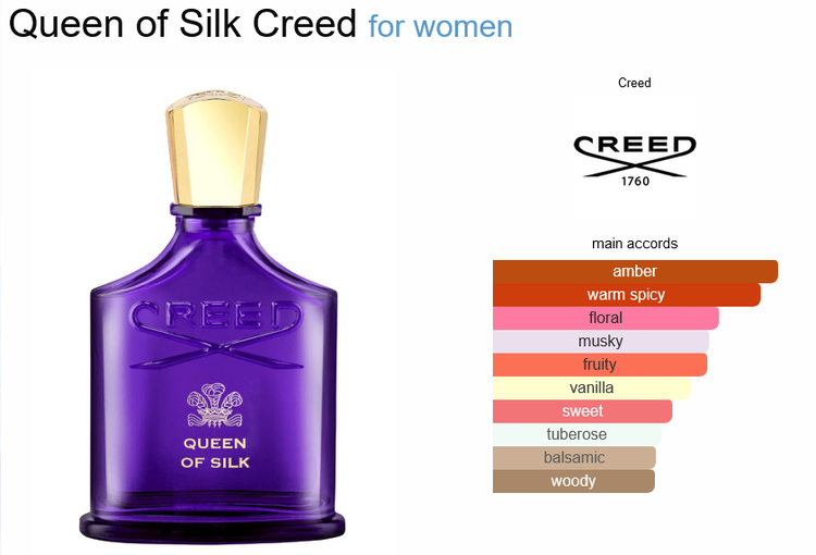 کویین اف سیلک، درخشش باشکوه و ظرافتهای آسمانی ابریشم را به تجسم درمیآورد، درحالی که نتهای گل اوسمانتوس چینی، نعناع هندی جاوهای و وانیل ماداگاسکار را بهنحوی با یکدیگر درهمبافته میکند که ردّی اغواگرانه و هوسانگیز خلق شود.